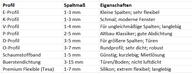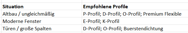 Dichtbänder für Fenster/Türen - Übersicht